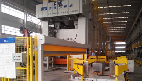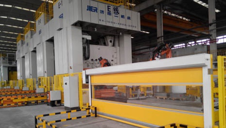 星喬某廠壓自動化生產線主要包括:機器人拆垛系統、雙料檢測系統、重力對中系統、機器人上料系統、線間機器人傳輸系統、線尾下料輸送系統、整線圍欄防護、控制系統等。 自動化生產線主要產品為車身內板件以及焊接結構件,產品生產工藝無需清洗涂油,故線首板件對中采用重力對中方式;線首重力對中系統結構簡潔、操作簡單方便、具有高性價比,但對異形板等特殊形狀板件無法實現對中,并且線首無法配置清洗機、或涂油機等板件處理裝置設備。 自動化生產線壓機(單動)滑塊行程次數為18 SPM,輪罩殼等小型沖壓件生產節拍達11 SPM,整線自動化開動率≥98%。