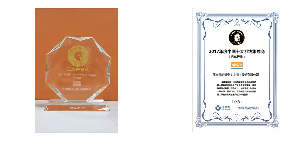 偉本智能榮獲2017年度中國十大系統集成商(汽車行業)恰佩克獎項:由恰佩克獎委員會和中國機器人網專家評委會及廣大用戶評審決議、評選依據技術專利、產品設計、年銷售額、利潤率人均產值、用戶口碑、產品優勢及其對中國機器人行業的重大技術貢獻及市場貢獻。