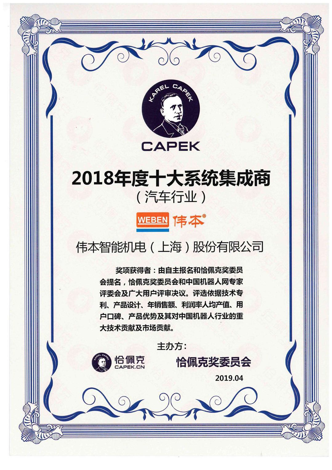 偉本智能榮獲2018年度中國十大系統集成商(汽車行業),偉本智能已連續四年榮獲此獎,恰佩克獎項:由自主報名和恰佩克獎委員會提名,恰佩克獎委員會和中國機器人網專家評委會及廣大用戶評審決議。評選依據技術專利、產品設計、年銷售額、利潤率人均產值、用戶口碑、產品優勢及其對中國機器人行業的重大技術貢獻及市場貢獻。