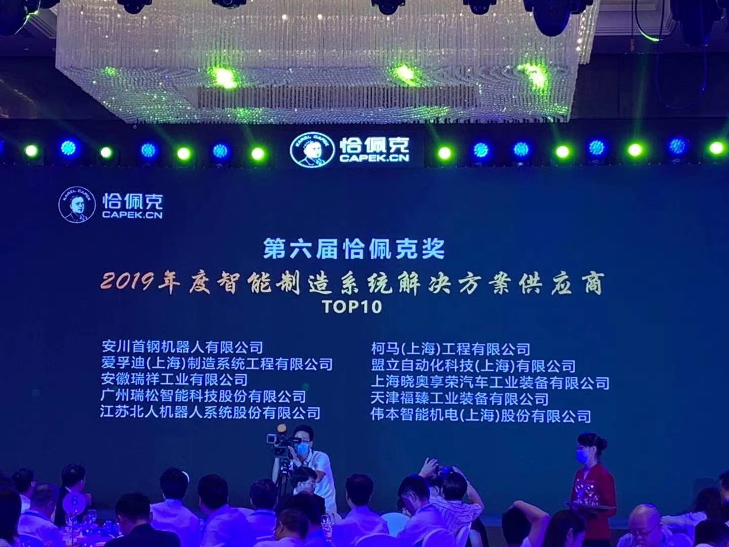 偉本智能榮獲2019年度智能制造系統解決方案供應商TOP10,偉本智能已連續五年榮獲此獎,本屆恰佩克頒獎儀式現場共頒發國外工業機器人、國內工業機器人、零部件、系統集成商、AGV、服務機器人及人工智能、品質獎、機器人產業園、投資孵化、個人獎共十個類別獎項。